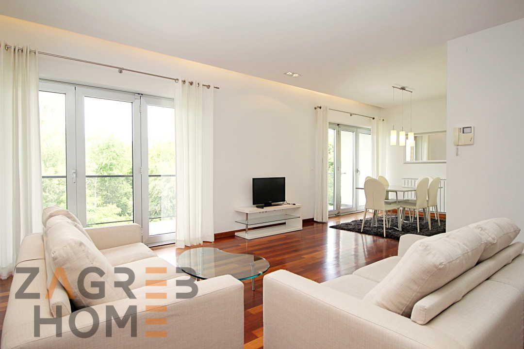 Kompletno namješten stan površine 116 m2 smješten je na 2. katu urbane vile (lift). Sastoji se od ulaznog hodnika, prostranog dnevnog boravka s blagovaonicom…